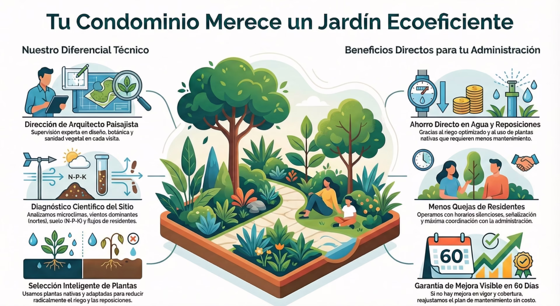 - Ecoeficiencia: riego sectorizado, goteo en jardineras, mulching, compostaje, programación estacional.