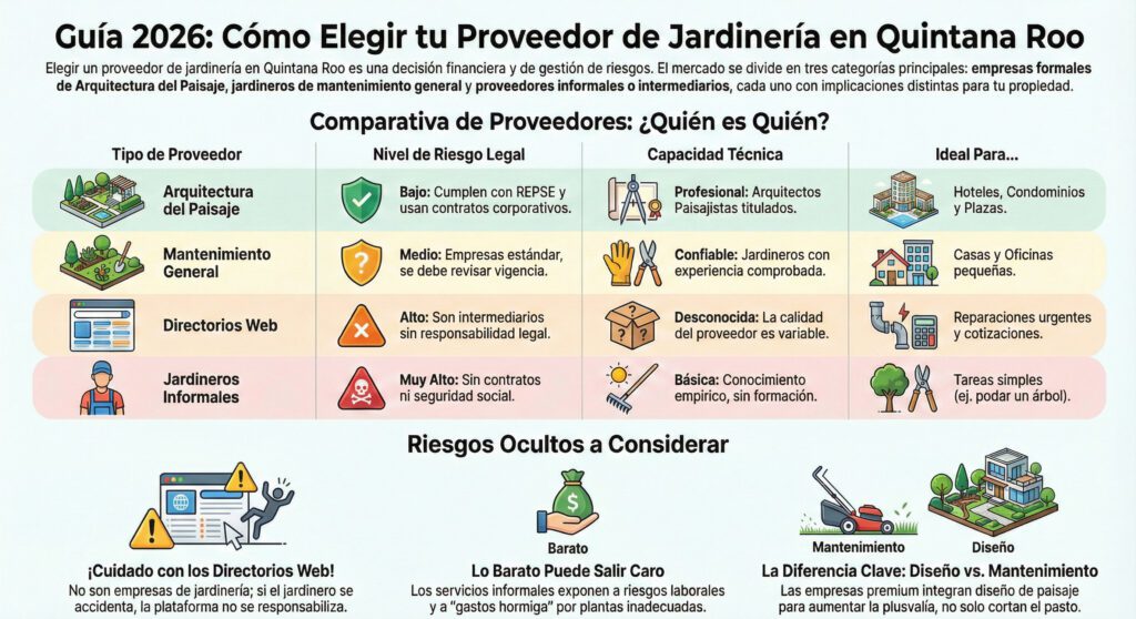 Elegir quién cuida la imagen de tu hotel o condominio es una decisión financiera. En 2026, la oferta en Cancún y la Riviera Maya se divide en tres: los directorios web, los jardineros informales y las empresas de Arquitectura del Paisaje. Este año, hemos actualizado nuestro análisis imparcial evaluando riesgos legales (REPSE), capacidad técnica y retorno de inversión.